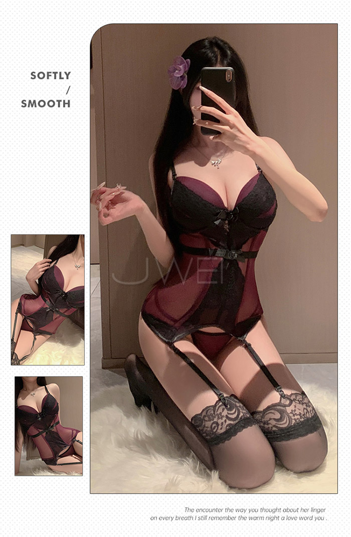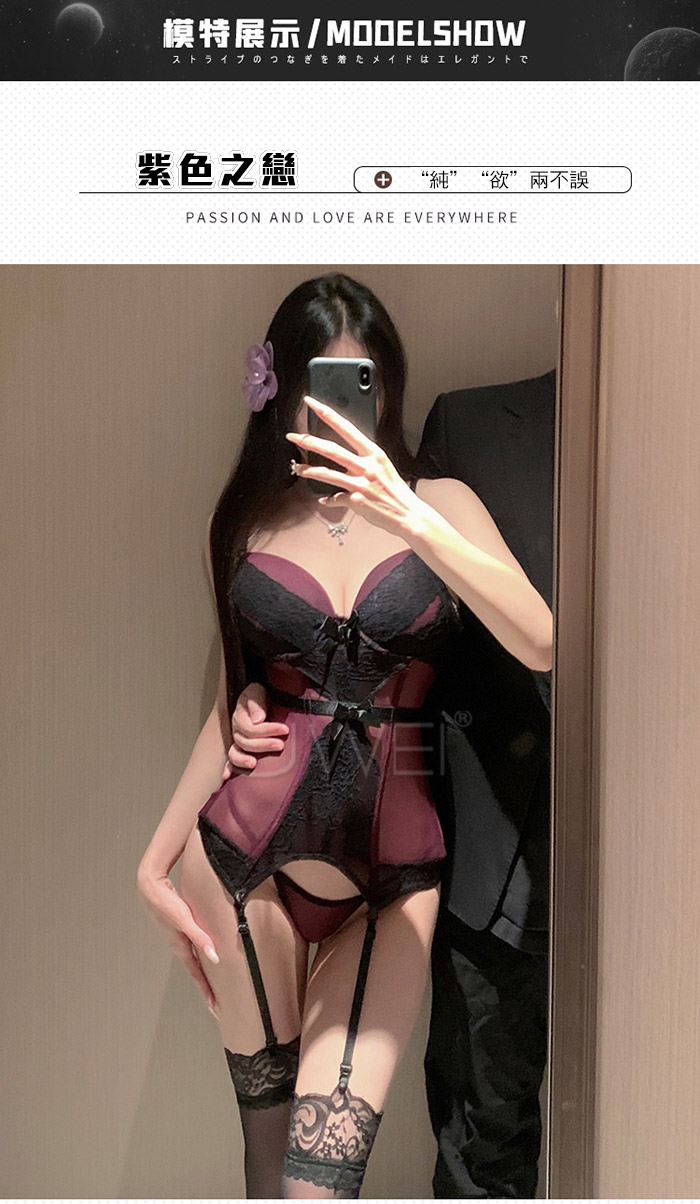 ►您現在的位置:首頁>暗夜之戀.性感蕾絲深V棉墊鋼托透視馬甲吊襪帶套裝-紫色【吊帶馬甲+T褲+吊襪帶】