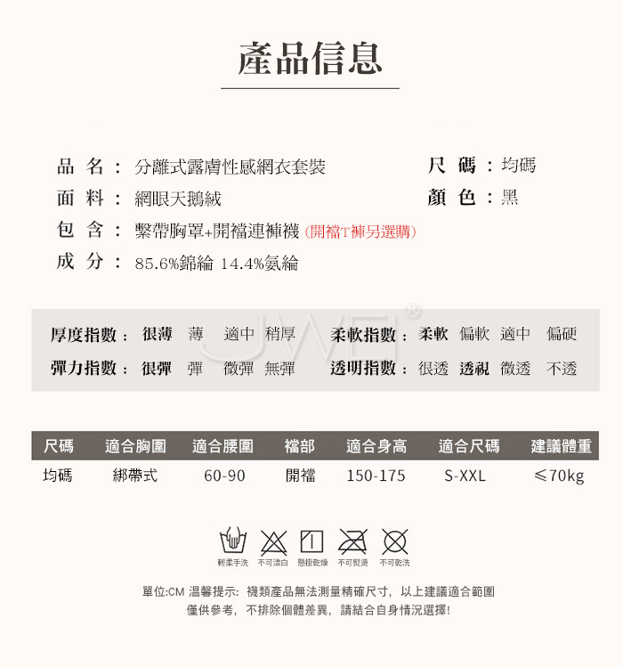 2.基於保障消費者個人衛生,情趣衣物類恕不接受退換貨,如為商品本身暇疵,接受三日內換貨,請勿試穿。