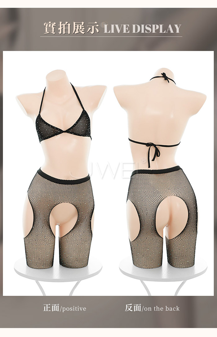 暗夜星芒.閃鑽露膚分離式開襠網襪套裝【繫帶胸罩+開襠連褲襪】