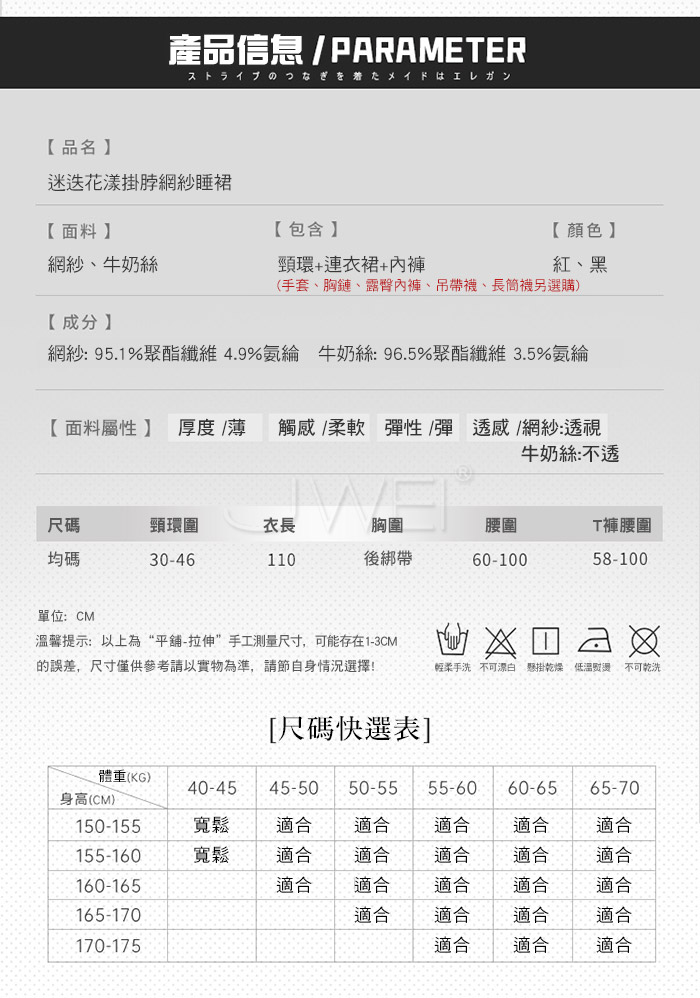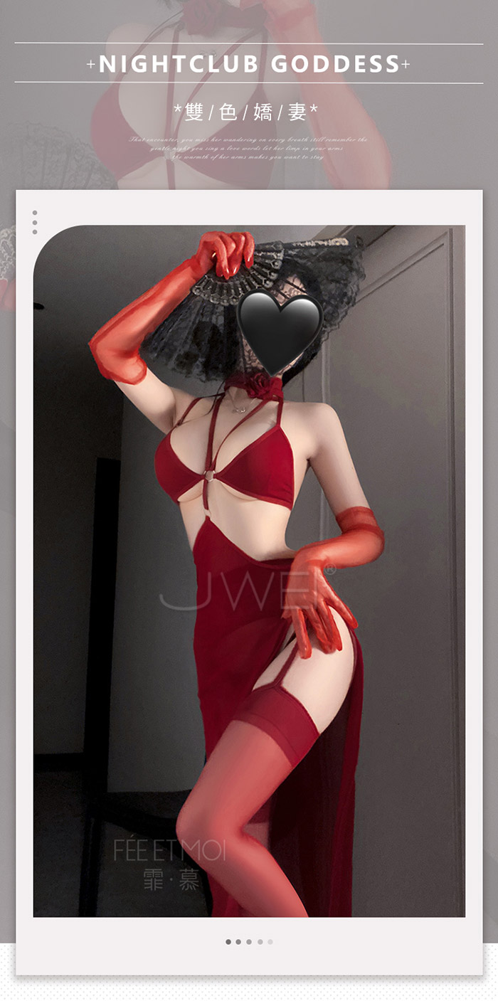 雙色嬌妻.迷迭花樣掛脖頸環美背側高衩網紗睡裙-紅【頸環+連身裙+內褲】