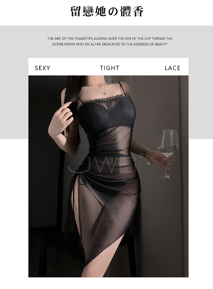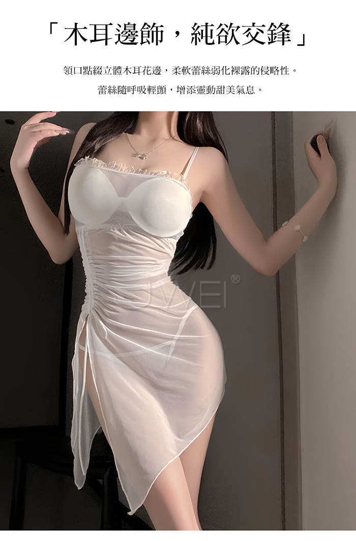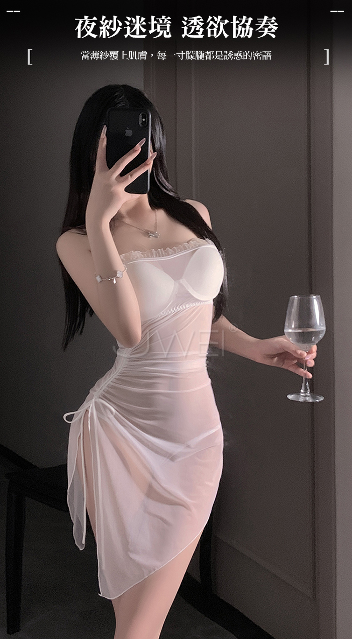 ►您現在的位置:首頁>夜紗迷境.韻味透紗木耳邊飾側開衩抽褶收腰睡裙【睡裙+T褲-白色】