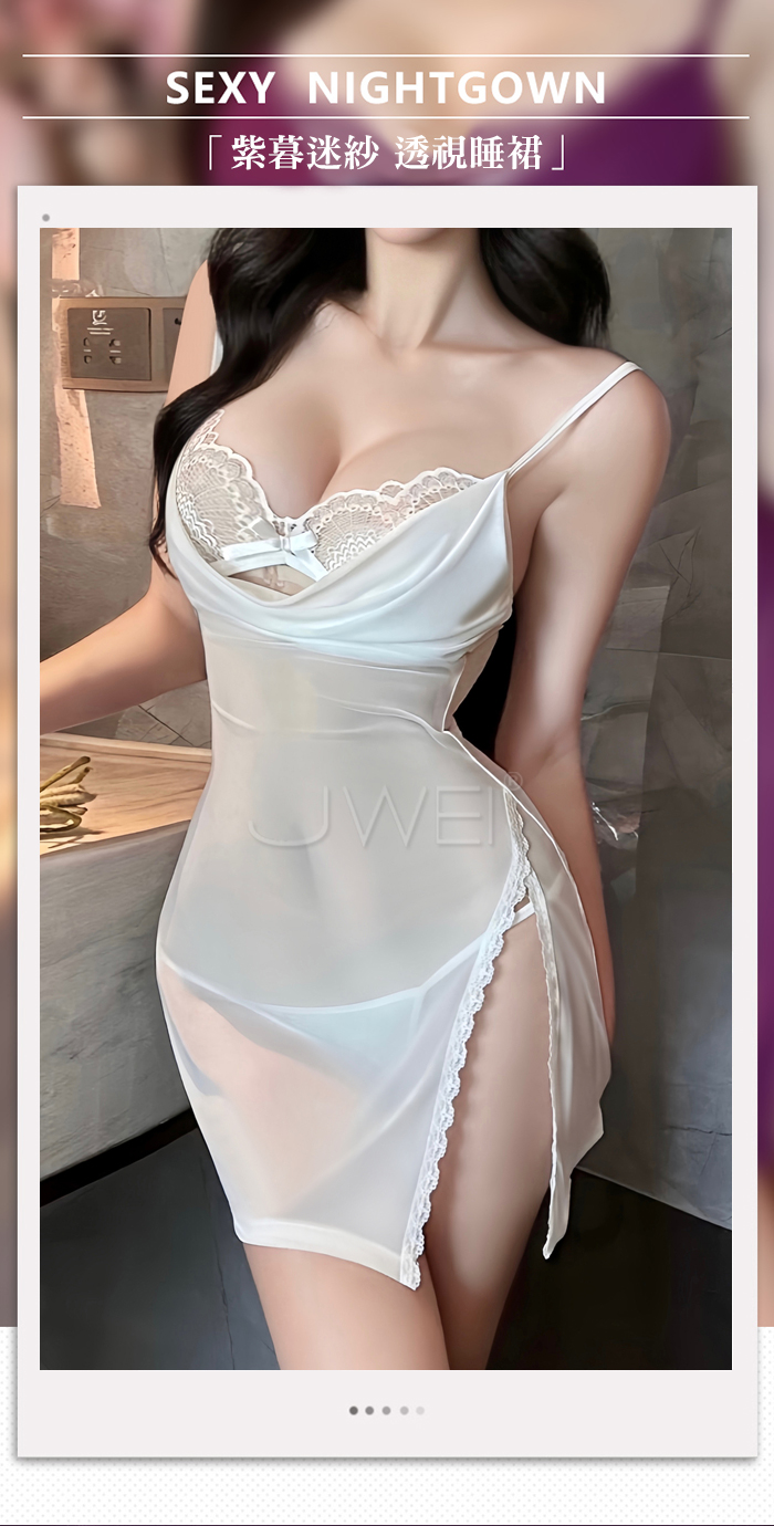 | 月暮迷紗.性感裸紗蕩領透視側開衩細肩帶美背睡裙【睡裙+T褲-白色】