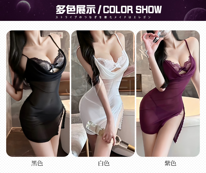 ►您現在的位置:首頁>月暮迷紗.性感裸紗蕩領透視側開衩細肩帶美背睡裙【睡裙+T褲-白色】
