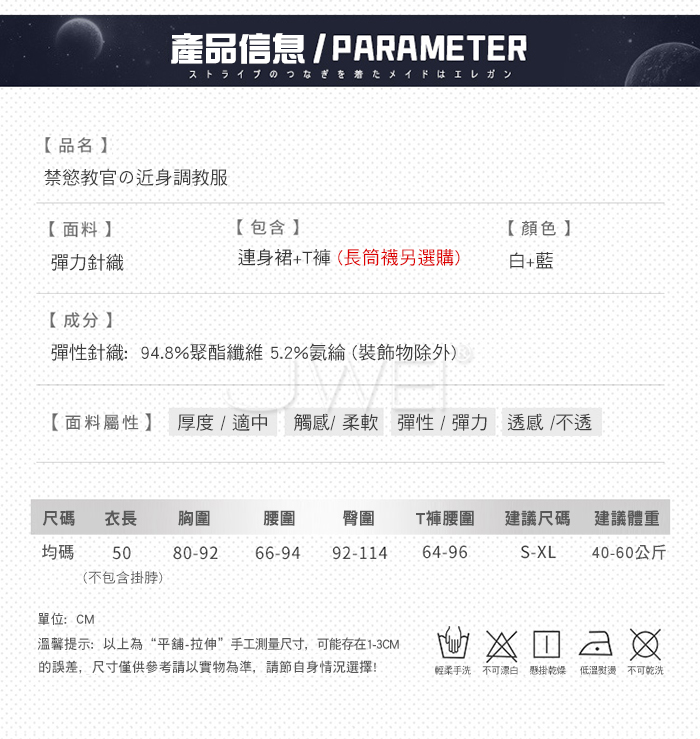 2.基於保障消費者個人衛生,情趣衣物類恕不接受退換貨,如為商品本身暇疵,接受三日內換貨,請勿試穿。