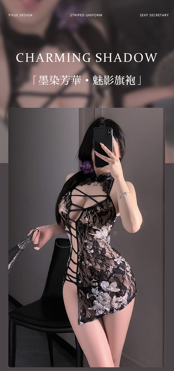 首頁>魅影芳華.國風蕾絲側開衩挖空露乳美背時尚旗袍【旗袍+T褲】