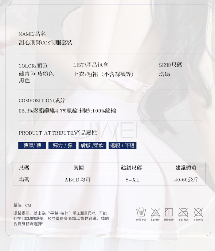 ►您現在的位置:首頁>甜心刑警.胸前交叉繫帶清純百褶透視白紗COS制服套裝【上衣+短裙-藍+白】