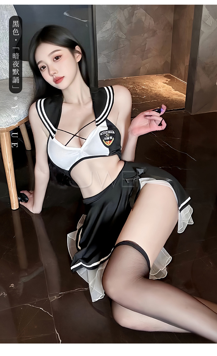 ►您現在的位置:首頁>甜心刑警.胸前交叉繫帶清純百褶透視白紗COS制服套裝【上衣+短裙-黑+白】